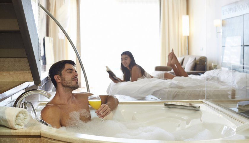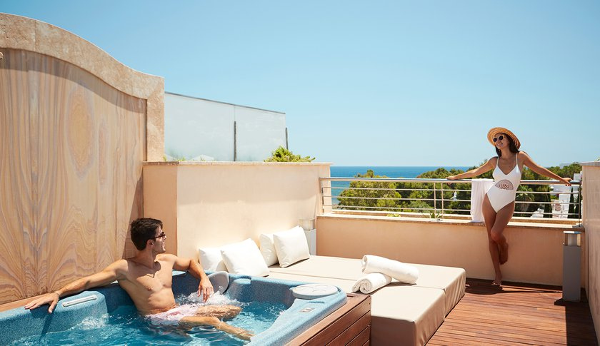 Private 26 m² sun deck with mini hydro-massage pool for two people, outdoor shower, chill-out area with daybed and parasol.