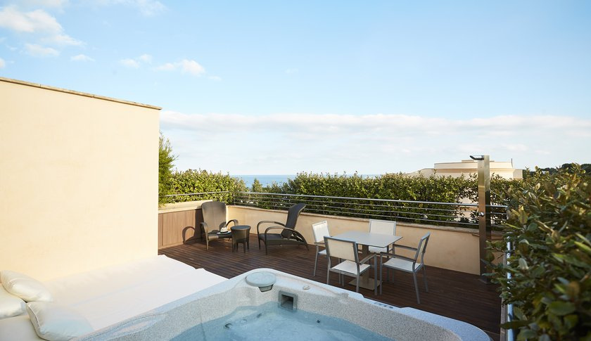 Private sundeck of 37 m² with mini hydro-massage pool for two people, sofa and parasol.
